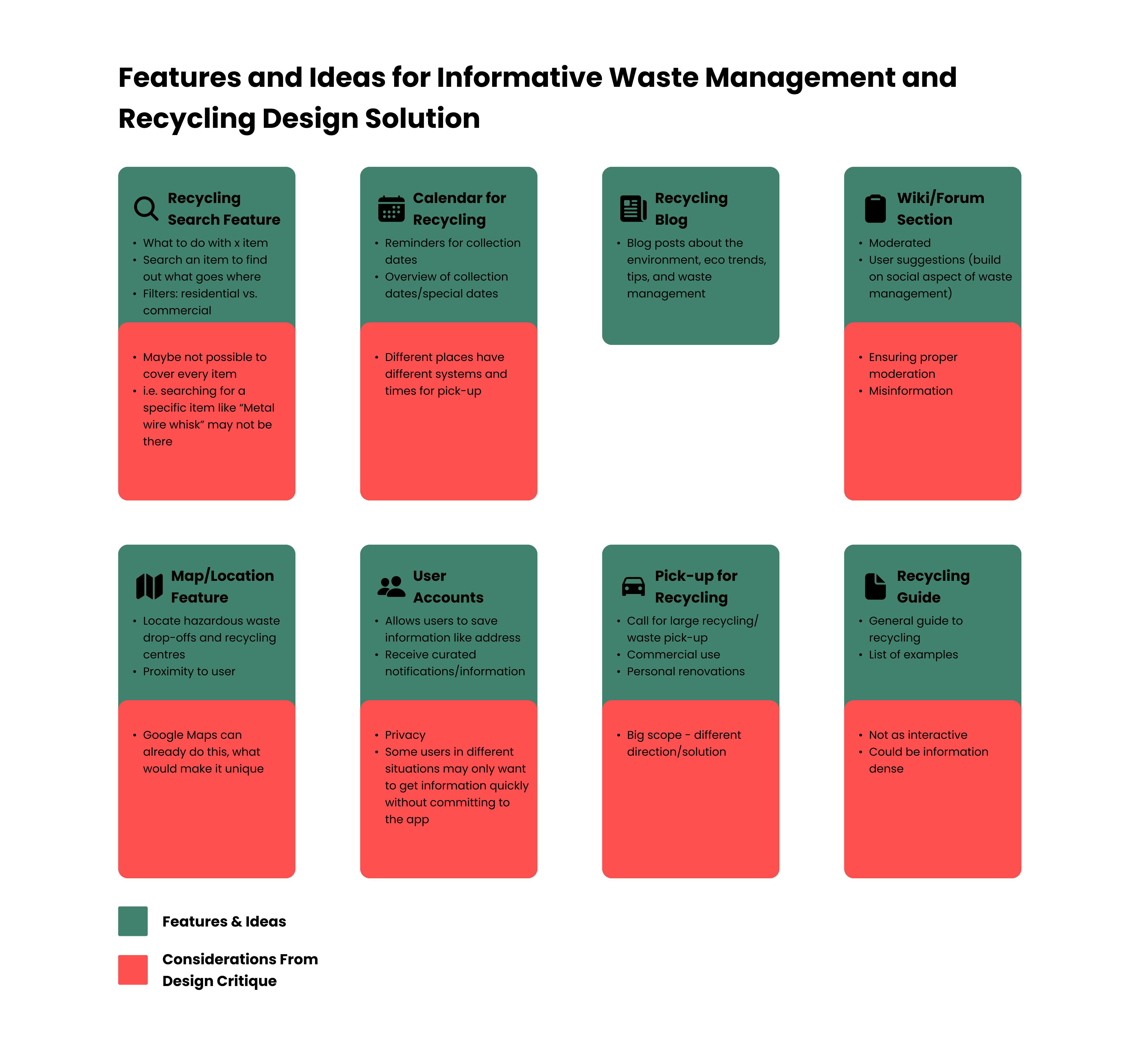 With a clear problem statement at hand, I moved to ideation. Here, I generated a multitude of problem-specific ways of addressing the informative waste management challenge.