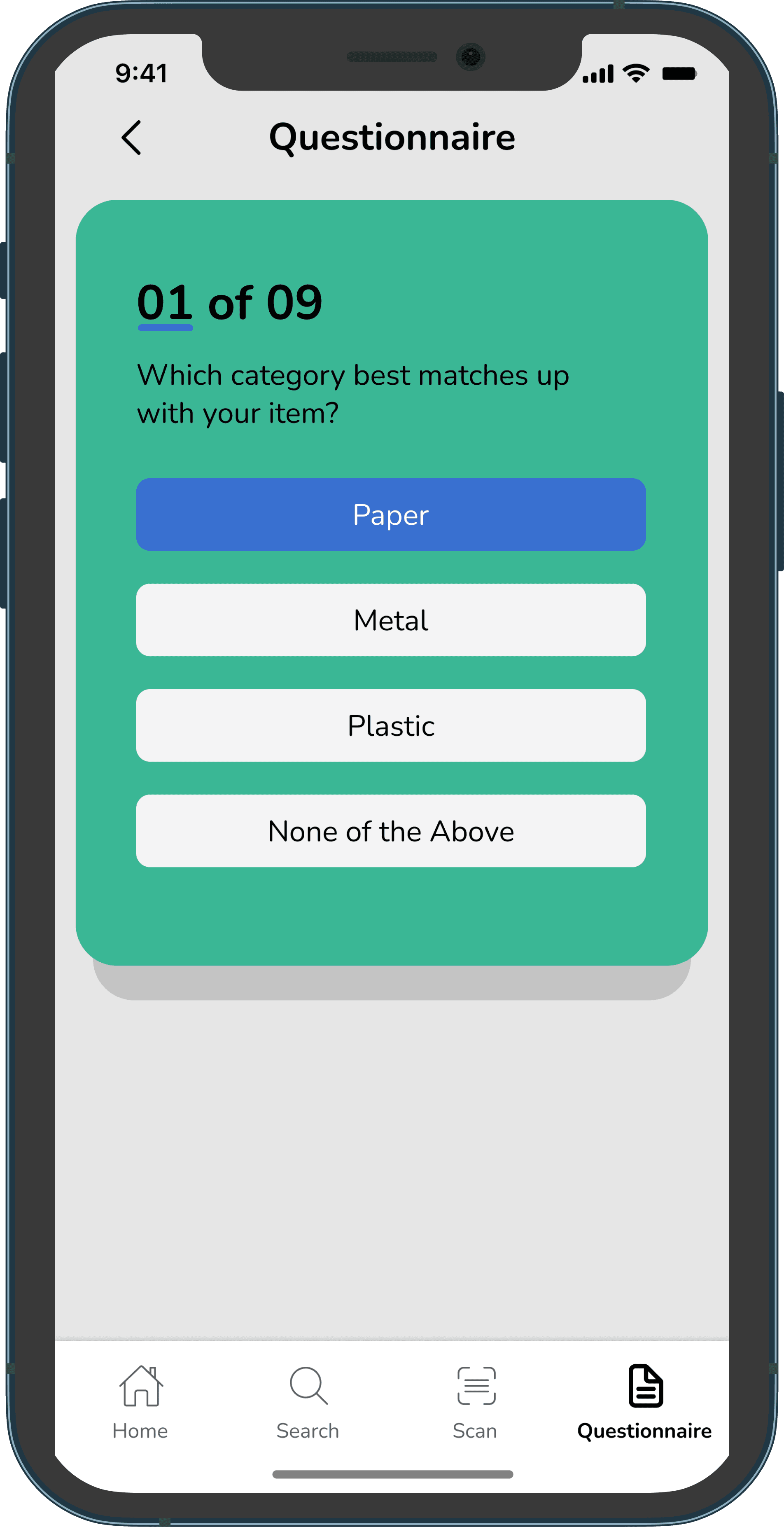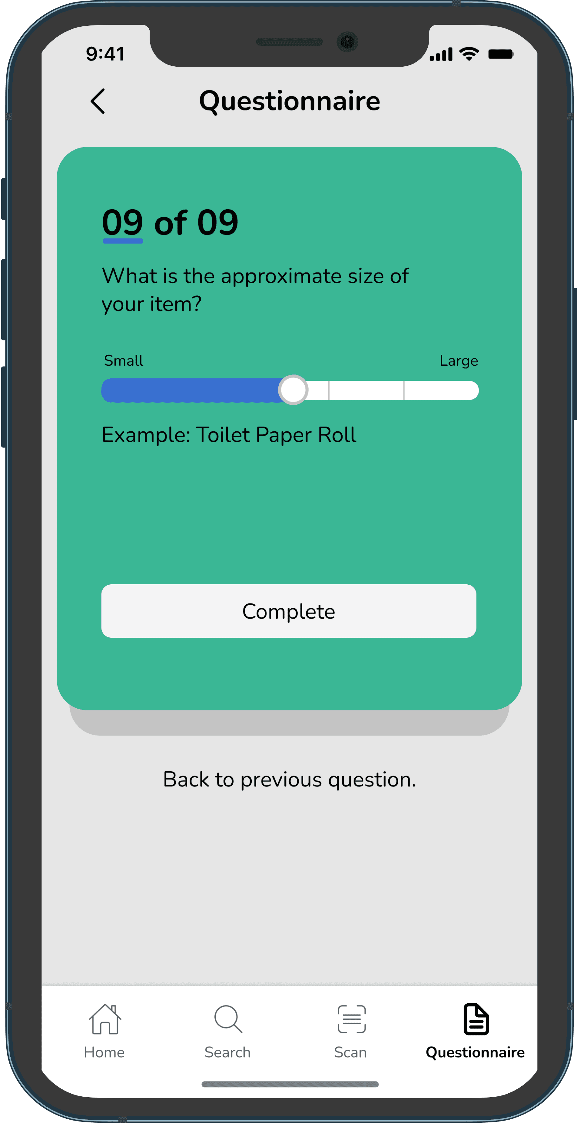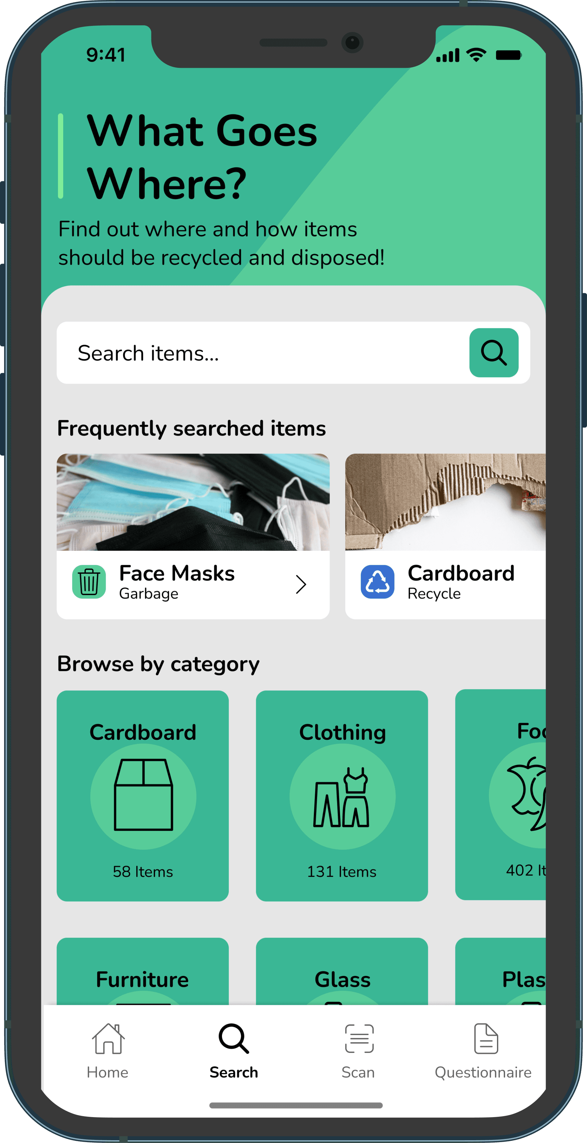 Searching for how to dispose of specific items with three search methods (search bar, questionnaire, item scan).
