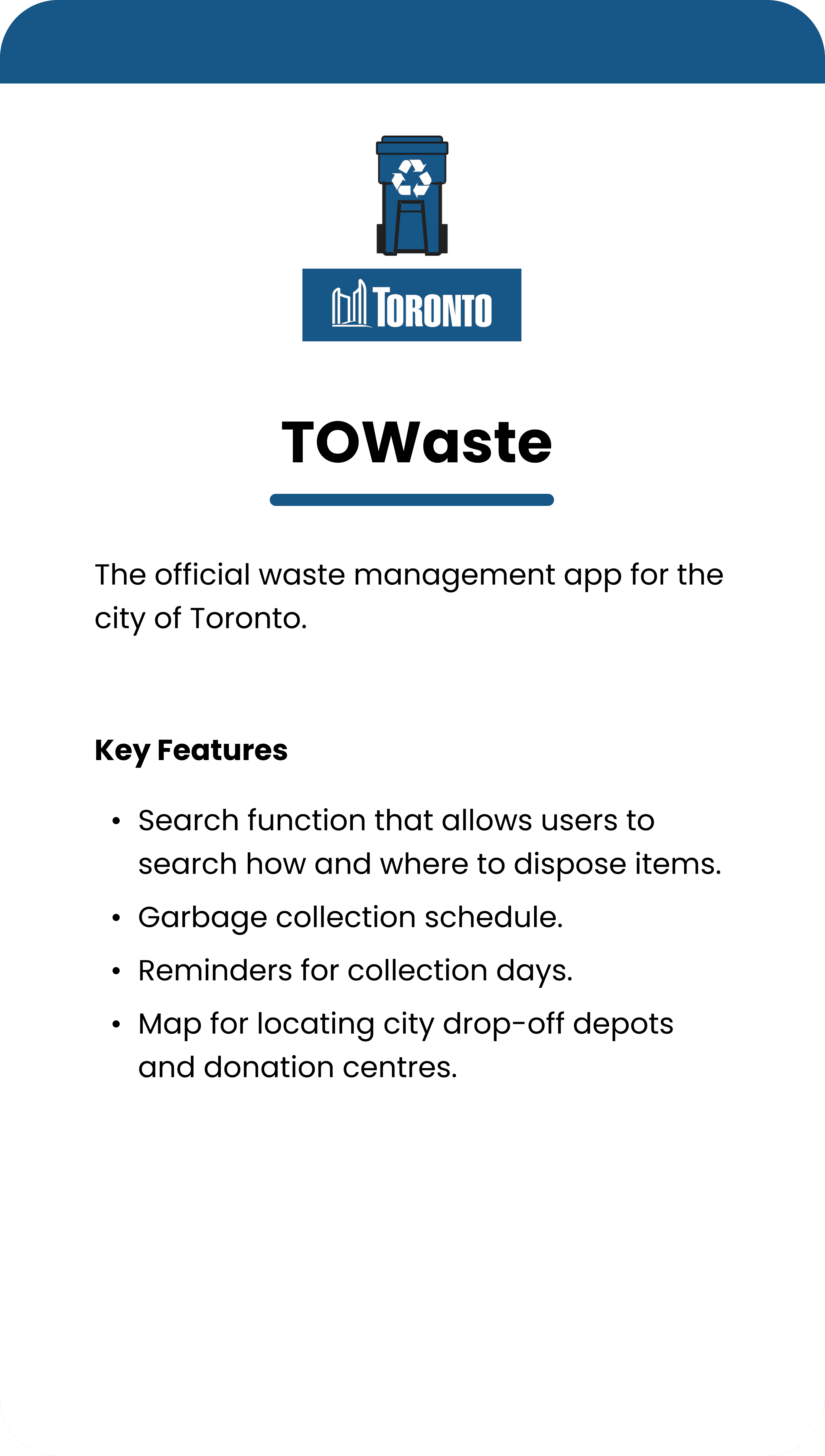 I also examined and used similar apps/governmental website solutions related to informing proper recycling and waste management. This allowed me to recognize what features and services are being offered, identify the strengths and weaknesses of these services, and gain insights on how to enhance my own ideas.
