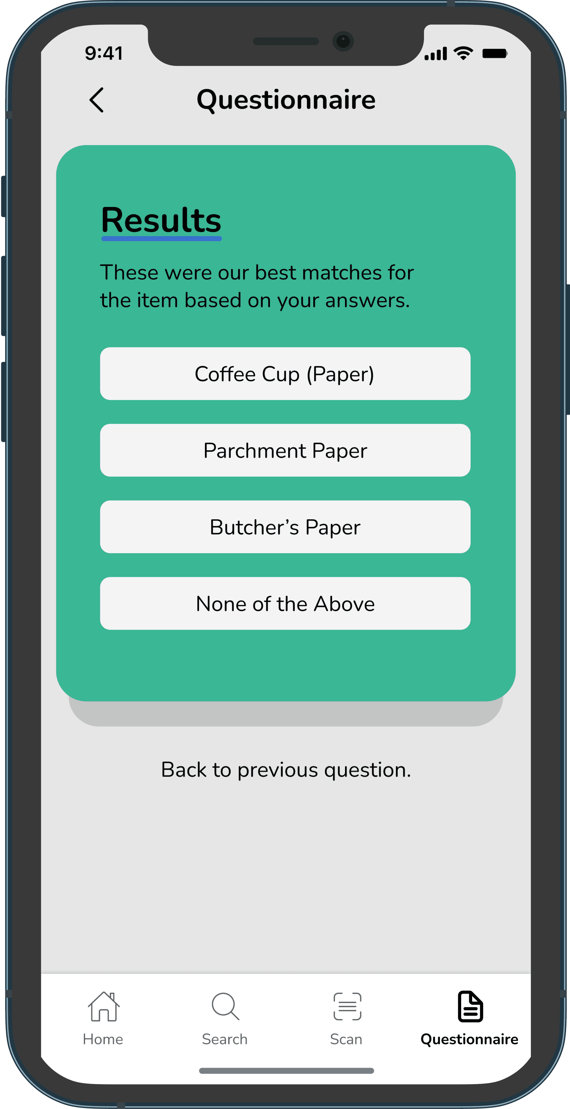 Search for items by answering questions where the provided answers will be used to suggest likely matches for the item and its recycling information.