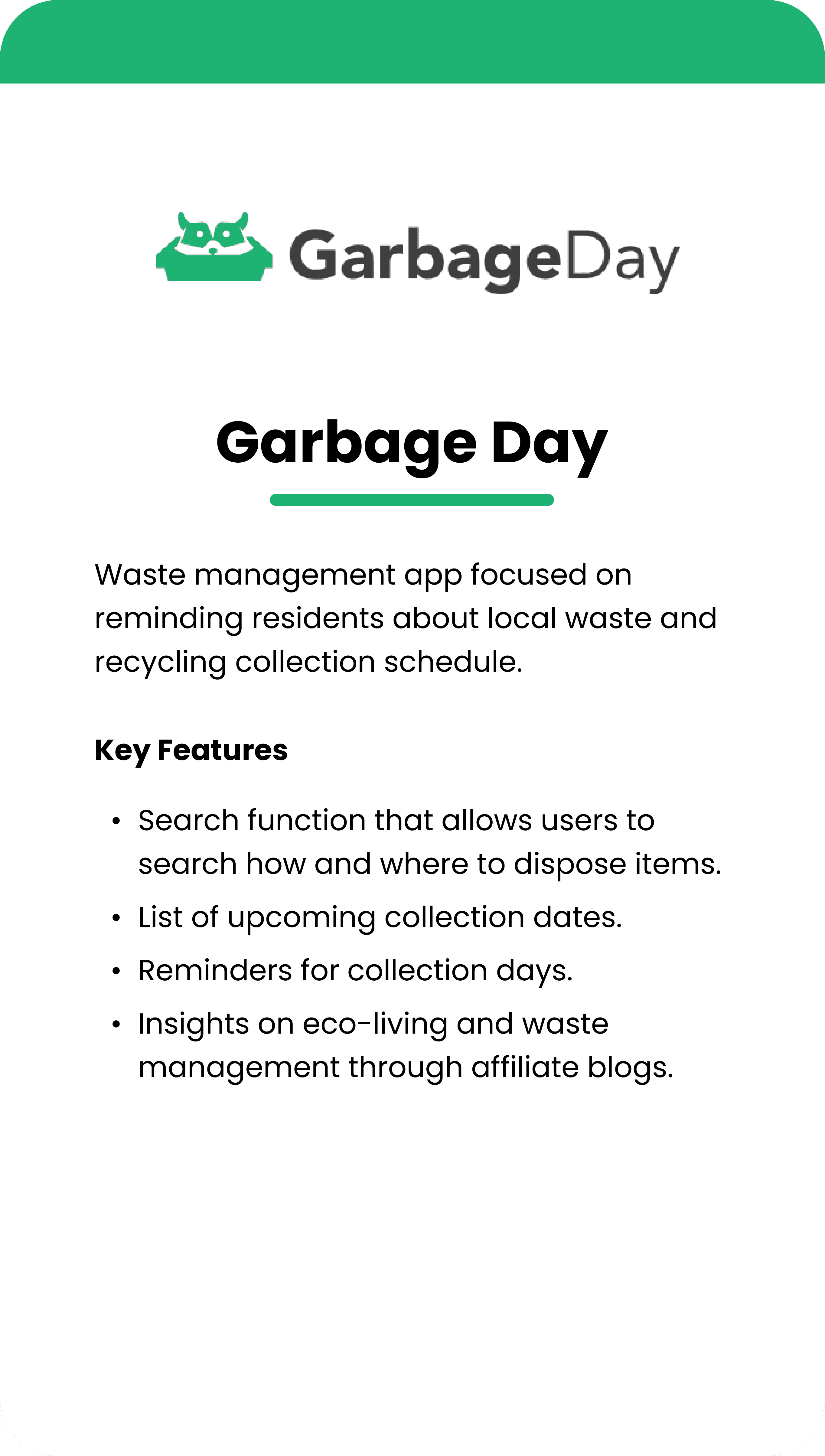 In the realm of recycling and waste management, existing solutions fail to effectively communicate essential recycling and waste management information. This leads to many residents having a lack of awareness and lack of knowledge when it comes to recycling the right way.