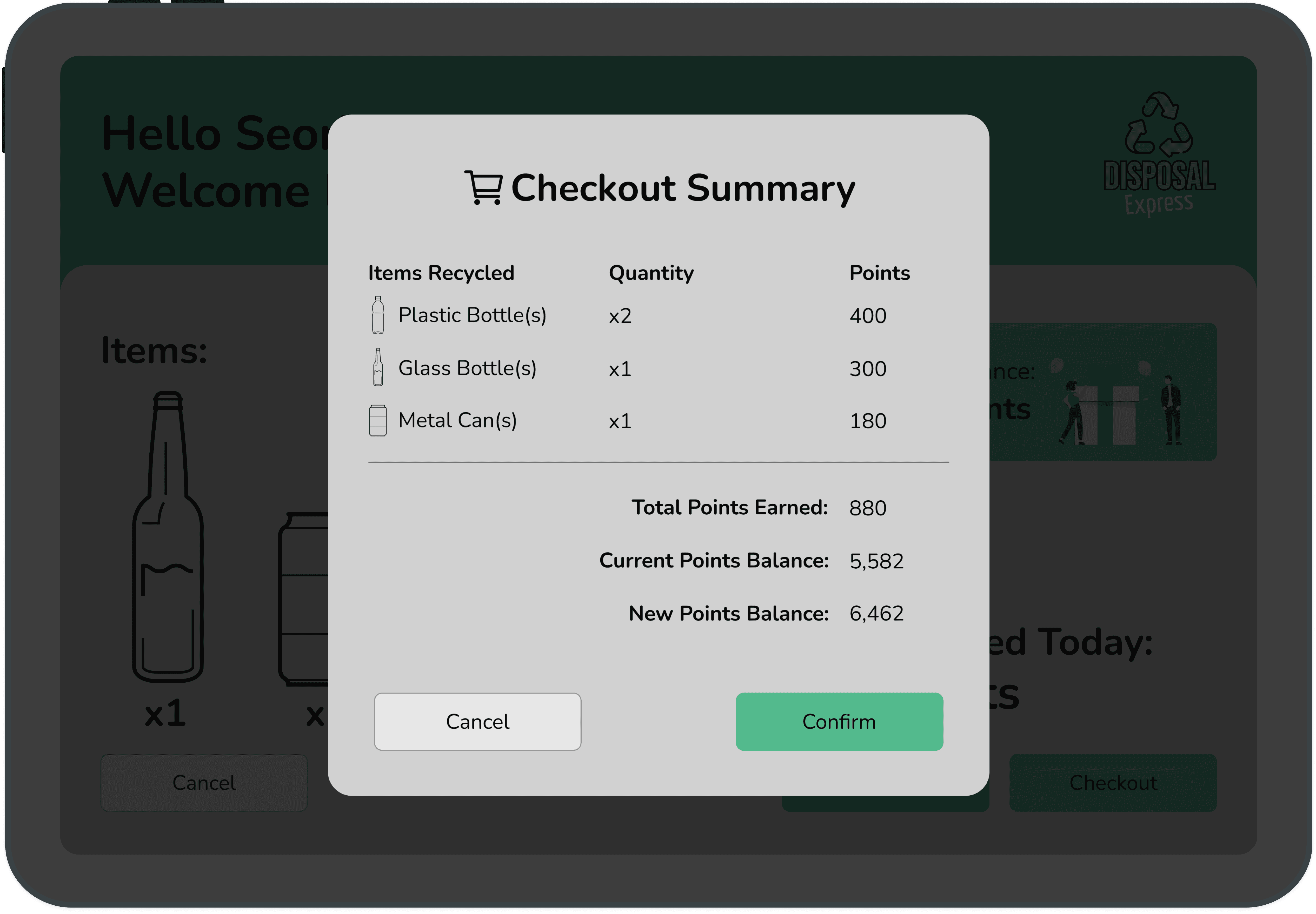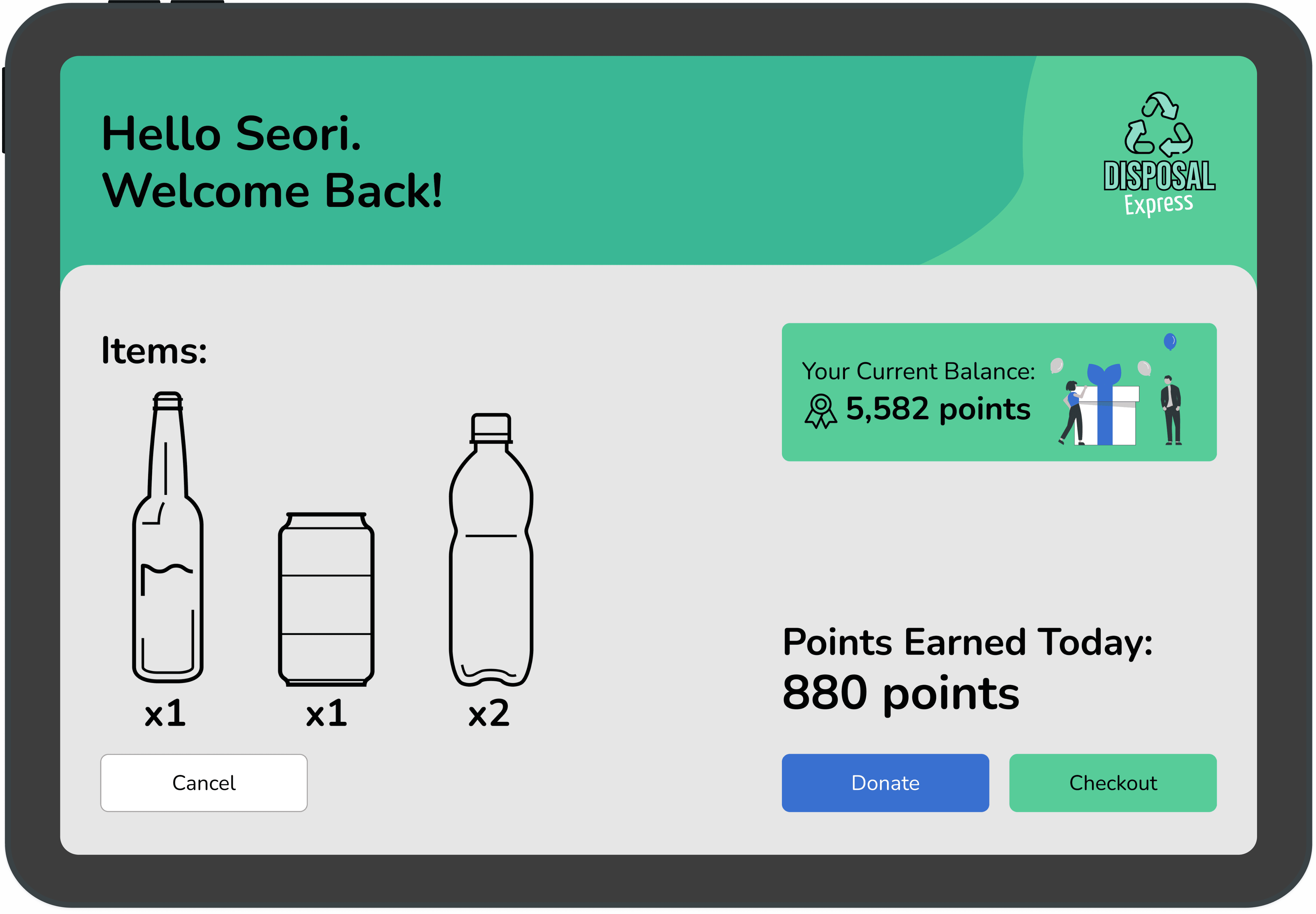 The kiosk interface facilitated straightforward interactions where residents can dispose of items using a reverse vending machine (RVM) in exchange for an incentive (reward points). The kiosk design prioritized user-friendliness in a public environment.